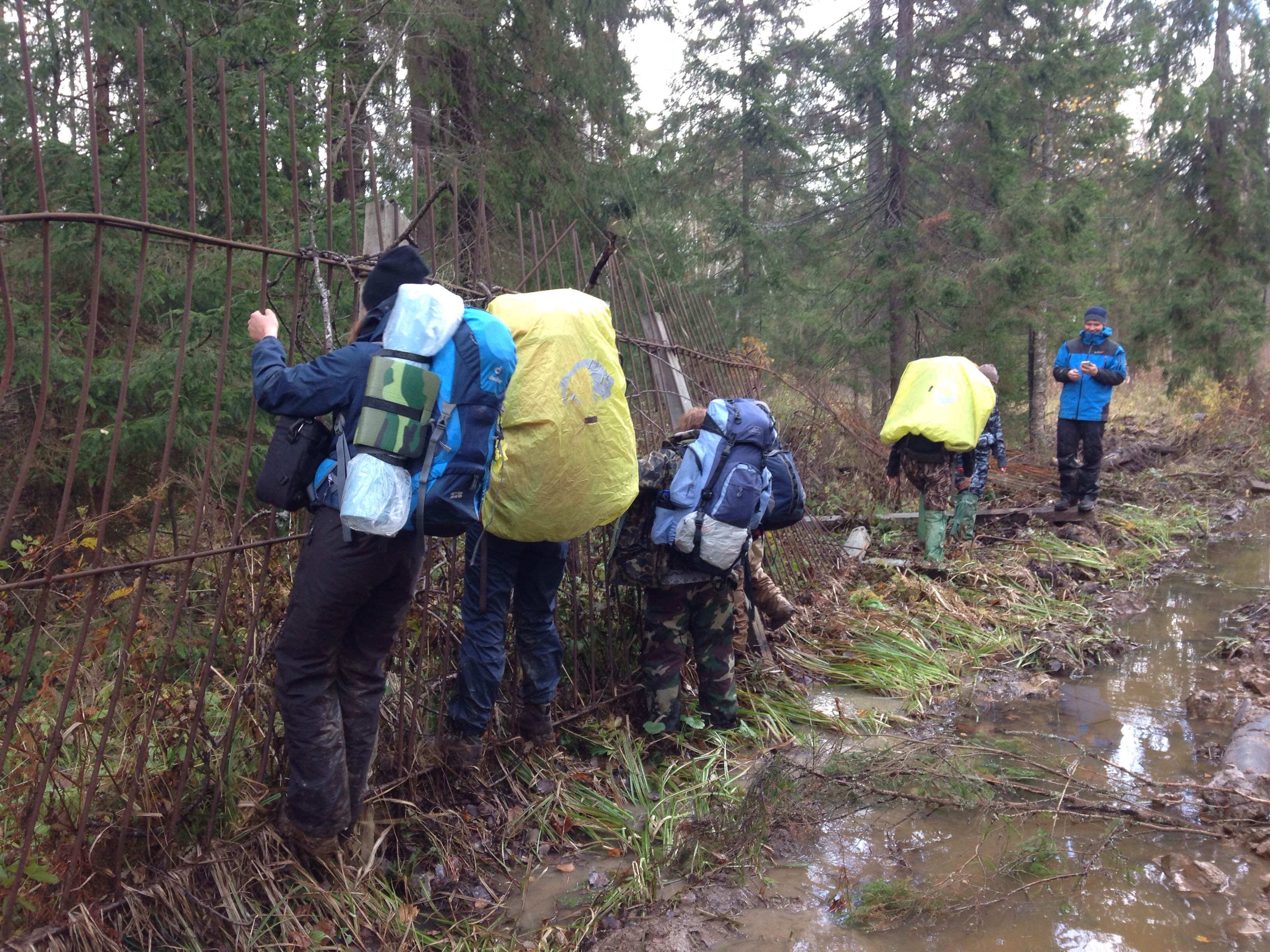 Состоялся сеанс связи! Леша Спешилов на "проводе": "Всем привет! У нас много воды, луж. Идем в бахилах. Скорость небольшая. Зато настроение отличное, бодрое! Планируем идти до 5 часов и искать стоянку. Завтра будем вставать пораньше, чтобы успеть пройти маршрут. Временами дождь. Соня - геройский герой! Пробовала идти в бахилах, но... эксперимент не удался." Теперь Соня преодолевает лужи при помощи Леши! Что-то еще было про Сонины штаны на веревочке (не поняла  ), неразборчиво... В общем, лужи и дождь туристам не помеха!