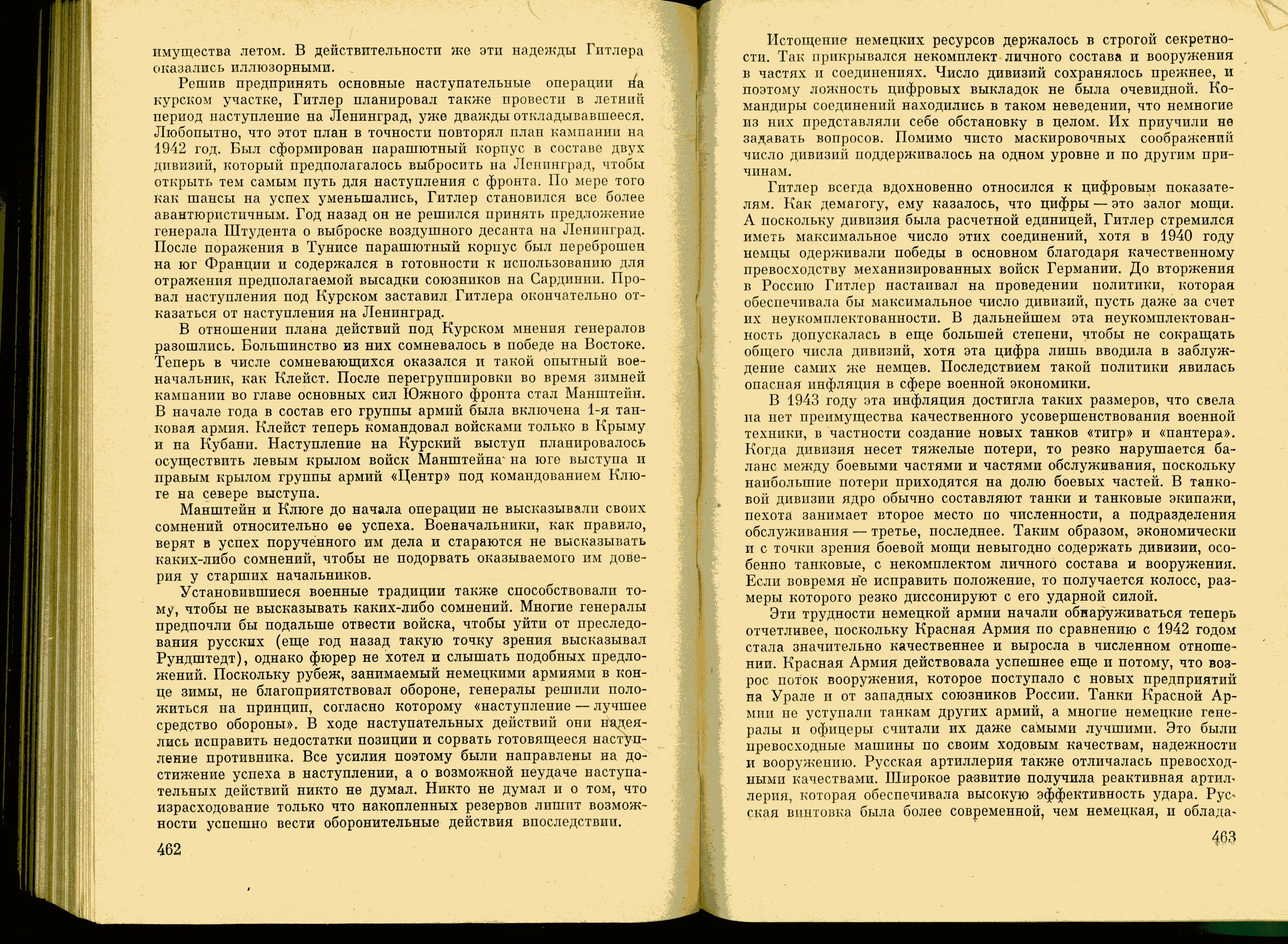 Перед Воронежским фронтом в настоящее время установлено: 1. Пехотных дивизий в первой линии девять(26,68,323,75,255,57, 332-я, 167-я и одна дивизия невыясненной нумерации). Эти дивизии занимают фронт Красно-Октябрьское-Большая Чернетчина-Краснополье-Казацкое. Дивизия неизвестной нумерации, по показаниям пленных, выдвигается к району Солдатское и должна сменить 332-ю пехотную дивизию. Эти данные проверяются. Есть непроверенные данные, что во втором эшелоне имеются шесть пехотных дивизий. Положение их пока не установлено, и эти данные также проверяются. В районе Харькова, по данным радиоразведки, отмечается штаб венгерской дивизии, которая может быть выдвинута на второстепенное направление. 2. Танковых дивизий всего сейчас шесть(«Великая Германия», «Адольф Гитлер», «Мёртвая голова», «Райх», 6-я и 11-я), из них три дивизии – в первой линии и три дивизии ((«Великая Германия», 6-я и 11-я) – во второй линии. По данным радиоразведки, штаб 17-ой танковой дивизии переместился из Алексеевского в Тащаговку, что говорит о выдвижении !7-ой танкой дивизии на север. По наличию сил противник имеет возможность вывести дополнительно в районе Белгорода до трёх танковых дивизий с участка Юго-Западного фронта. 3. Таким образом, следует ожидать, что противник перед Воронежским фронтом сможет создать ударную группу силой до 10 танковых дивизий и не менее шести пехотных дивизий, всего до 1500 танков, сосредоточения которых следует ожидать в районе Борисовка-Белгород-Муром-Казачья Лопань. Эта ударная группа может быть поддержана сильной авиацией численностью примерно до 500 бомбардировщиков и не менее 300 истребителей. Намерение противника – нанести концентрические удары из района Белгорода на северо-восток и из района Орла на юго-восток, с тем чтобы окружить наши войска, находящиеся западнее линии Белгород- Курск. В дальнейшем следует ожидать удара противника в юго-восточном направлении во фланг и тыл Юго-Западному фронту, с тем чтобы затем действовать в северном направлении. Однако не исключена возможность, что в этом году противник откажется от плана наступления на юго-восток и будет проводить другой план, именно после концентрических ударов из района Белгорода т Орла он наметит наступление на северо-восток для обхода Москвы. С этой возможностью следует считаться и соответственно готовить резервы. Таким образом, перед Воронежским фронтом противник вероятнее всего будет наносить главный удар из района Борисовка-Белгород в направлении на Старый Оскол и частью сил на Обоянь и Курск. Вспомогательные удары следует ожидать в направлении Волчанск-Новый Оскол и Суджа-Обоянь-Курск. Для крупного наступления противник сейчас еще не готов. Начала наступления следует ожидать не ранее 20 апреля с.г., а вероятнее всего в первых числах мая. Однако частных атак можно ожидать в любое время. Поэтому от наших войск требуем постоянной высокой готовности. Фёдоров, Никитин, Федотов. №55»