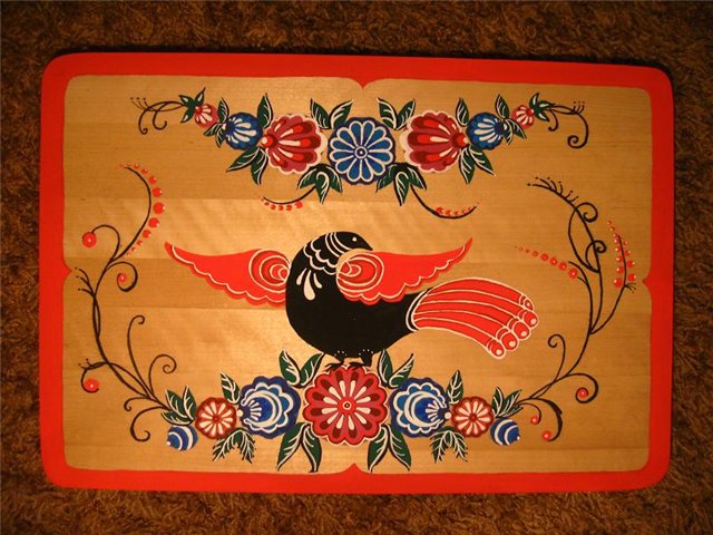 а ещё я не знаю как сворачивать вложения ,чтобы не разбивать тему  "Один из традиционных декоративных промыслов - городецкая роспись - сложился с середины 19 века в окрестностях Городца, основанного еще в 12 веке, что находится на левом берегу Волги в Нижегородской области <...> Сложился и свой прием росписи - сначала на изделие наносился фон, одновременно служивший и грунтовкой, затем по нему наносятся толстой кистью крупные цветовые пятна, так называемый "подмалевок". После этого более тонкой кисточкой наносятся необходимые штрихи, затем роспись заканчивает "разживка" - когда рисунок объединяется в цельную композицию с помощью черной краски и белил. Законченную композицию обычно ограничивают рамкой."