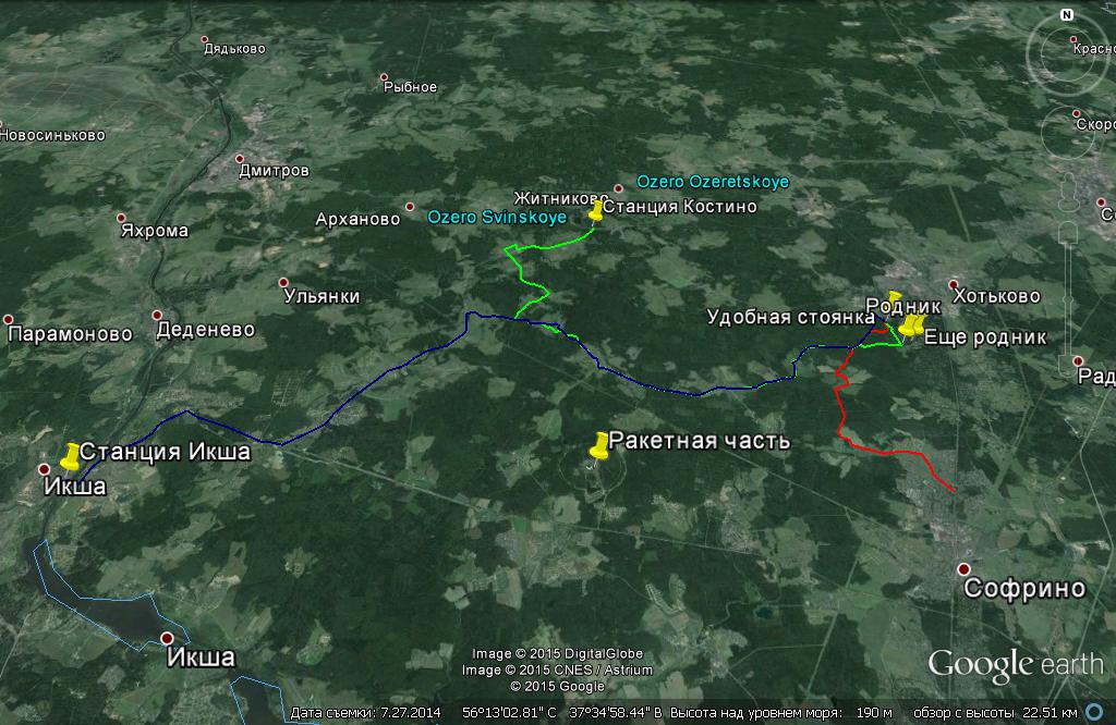 Что касается зеленой нитки - на станцию Костино ходит очень мало электирчек. Это кольцо, туда 2 раза в день ходит поезд от Дмитрова и 2-3 электрички из Москвы. Опоздаем - следующей не будет.