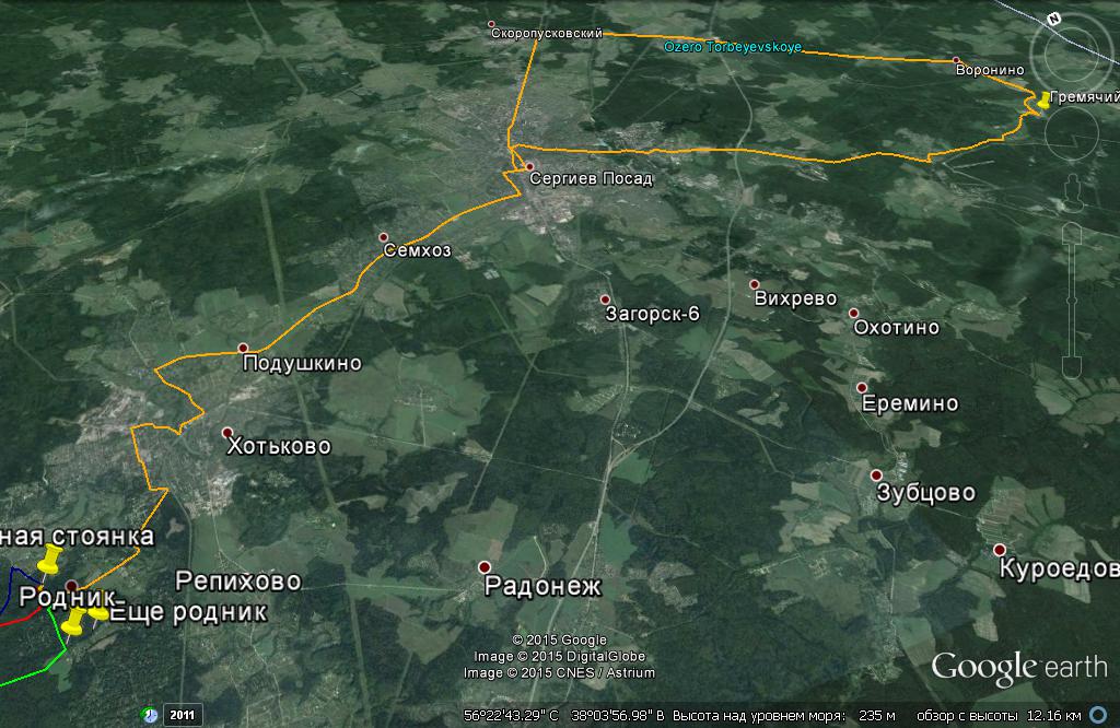 Вот продолжение маршрута. Если делать марш-бросок на Гремячий, это 60км. Можно проехать на электричке от Абрамцево до С-Посада, чтобы меньше колесить по полям да по СНТ. Место реально стоящее, тем более его сейчас обустраивают, чуть ли не терем построили. Если не хотим - просто доезжаем до С-Посада.